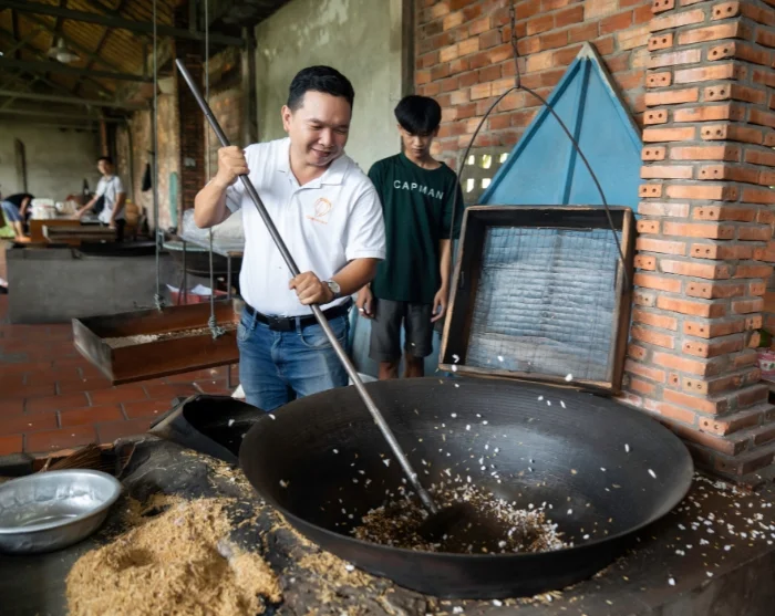 Deretter fortsetter du til vårt sosiale bærekraftsprosjekt i Vinh Long, som er etablert av vår lokale samarbeidspartner. Her venter en rolig spasertur gjennom landsbyen, hvor din guide gir deg innsikt i prosjektet underveis. Du får også mulighet til å ta del i det tradisjonelle landbrukslivet. Sammen med lokale bønder kan du prøve deg på risdyrking – enten ved å plante små risplanter eller bidra til innhøstingen, avhengig av sesong. Dette er en lærerik og jordnær opplevelse som gir deg et unikt innblikk i hverdagen på landsbygda i Vietnam og i arbeidet som ligger bak et bærekraftig jordbruk. Når du deltar på turen, bidrar du samtidig til å gjøre en forskjell for familiene i Vinh Long, siden en prosentandel av reisens pris går direkte til prosjektet, som du kan lese mer om her.