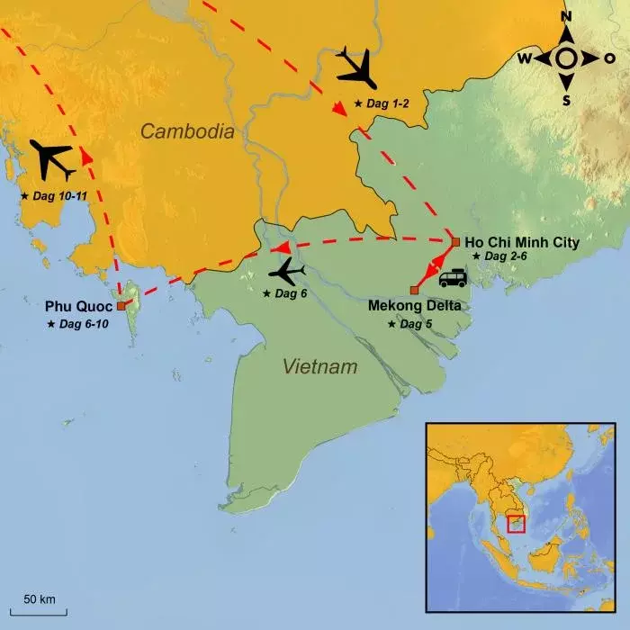 I dag flyr du til øya Phu Quoc, som ligger utenfor Vietnams vestkyst i Siambukten, nær Kambodsja. Du blir hentet på hotellet og kjørt til Tan Son Nhat flyplass, hvorfra du tar en flytur på litt over en time. Ved ankomst til Phu Quoc flyplass blir du hentet og kjørt til ditt hotell, og etter innsjekking er resten av dagen til fri disposisjon. Ta på badetøy og nyt et forfriskende bad i hotellets basseng eller på den gylne sandstranden.
