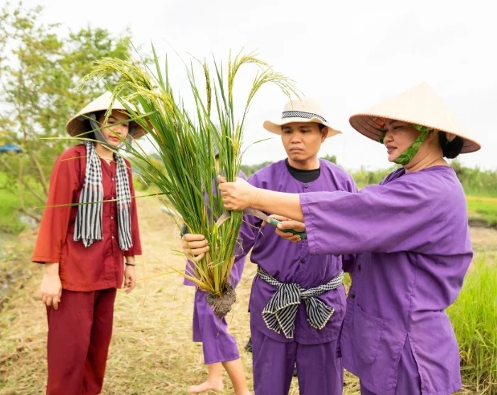 Deretter fortsetter du til vårt sosiale bærekraftsprosjekt i Vinh Long, som er etablert av vår lokale samarbeidspartner. Her venter en rolig spasertur gjennom landsbyen, hvor din guide gir deg innsikt i prosjektet underveis. Du får også mulighet til å ta del i det tradisjonelle landbrukslivet. Sammen med lokale bønder kan du prøve deg på risdyrking – enten ved å plante små risplanter eller bidra til innhøstingen, avhengig av sesong. Dette er en lærerik og jordnær opplevelse som gir deg et unikt innblikk i hverdagen på landsbygda i Vietnam og i arbeidet som ligger bak et bærekraftig jordbruk. Når du deltar på turen, bidrar du samtidig til å gjøre en forskjell for familiene i Vinh Long, siden en prosentandel av reisens pris går direkte til prosjektet, som du kan lese mer om her.